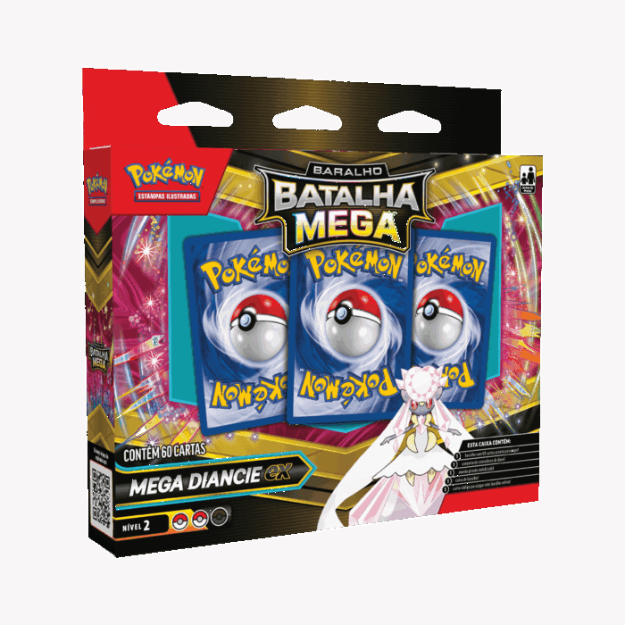 - Deck pré-montado oficial com Mega Diancie Ex em destaque, oferecendo uma peça poderosa e com apelo visual para sua coleção ou jogo